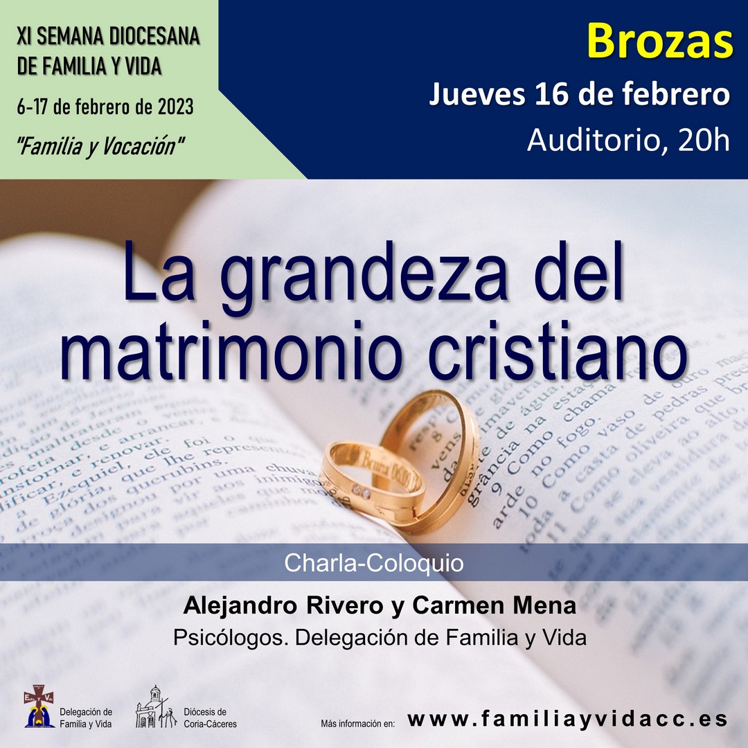 - Brozas . Jueves 16 de febrero. Auditorio, 20h. La grandeza del matrimonio cristiano. Alejandro Rivero y Carmen Mena, psicólogos.