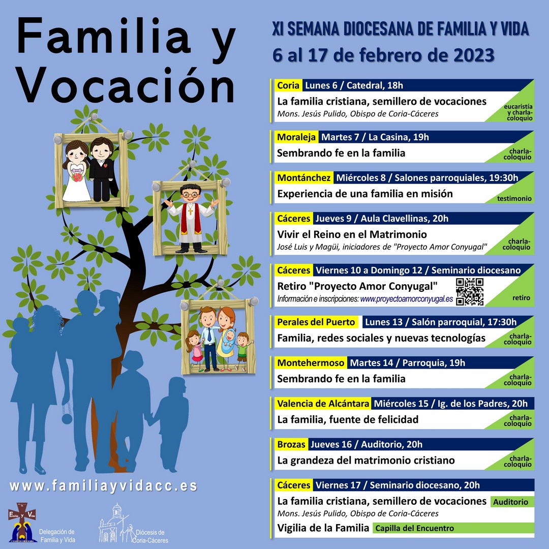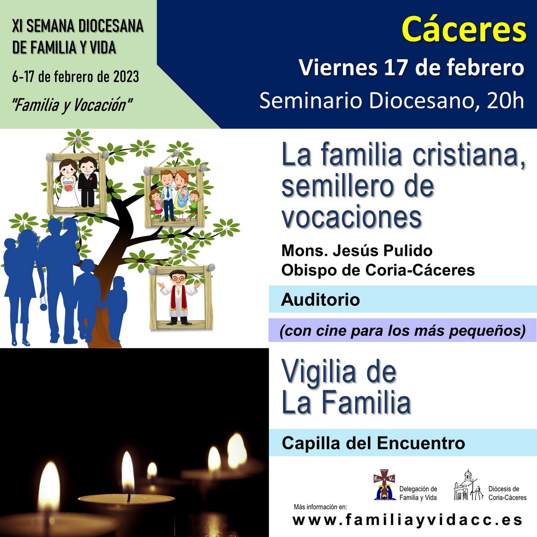- Cáceres . Viernes 17 de febrero. Seminario diocesano, 20h. Jornada de clausura. La familia cristiana, semillero de vocaciones (Auditorio). Mons. Jesús Pulido, Obispo de Coria-Cáceres. A continuación: Vigilia de la Familia (Capilla del Encuentro).