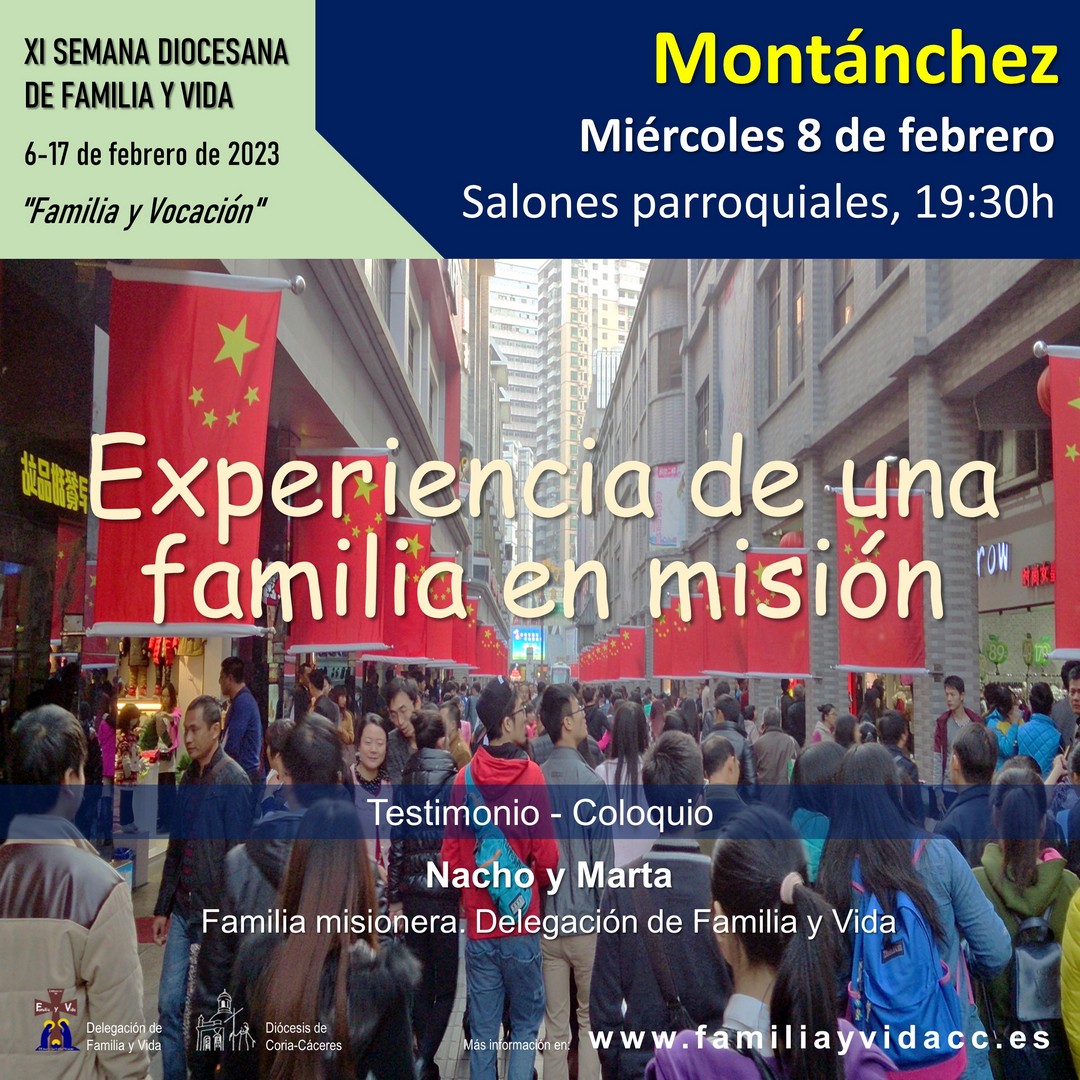 - Montánchez . Miércoles 8 de febrero. Salones parroquiales, 19:30h. Experiencia de una familia en misión. Nacho y Marta, familia misionera.