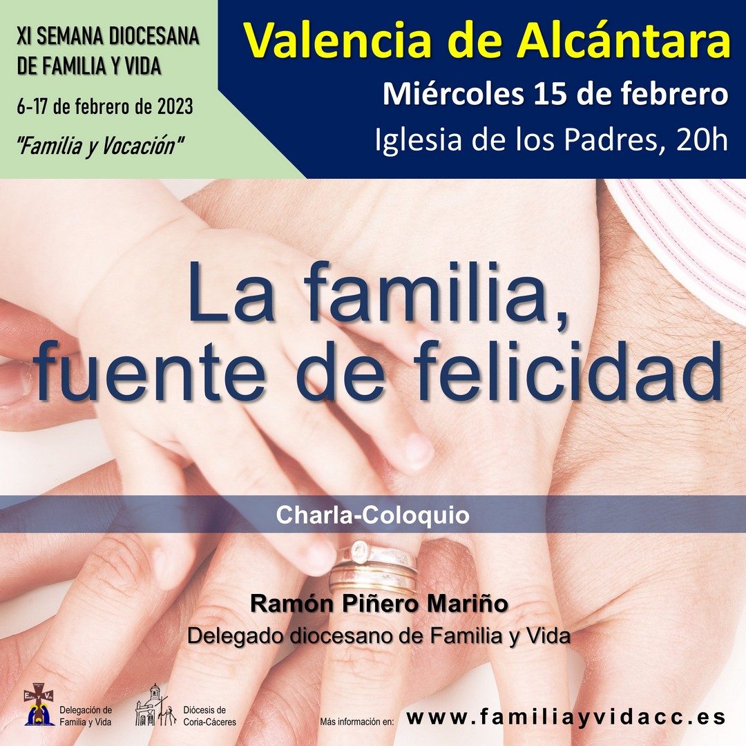 - Valencia de Alcántara . Miércoles 15 de febrero. Iglesia de los Padres, 20h. La familia, fuente de felicidad. Ramón Piñero, delegado diocesano de Familia y Vida.